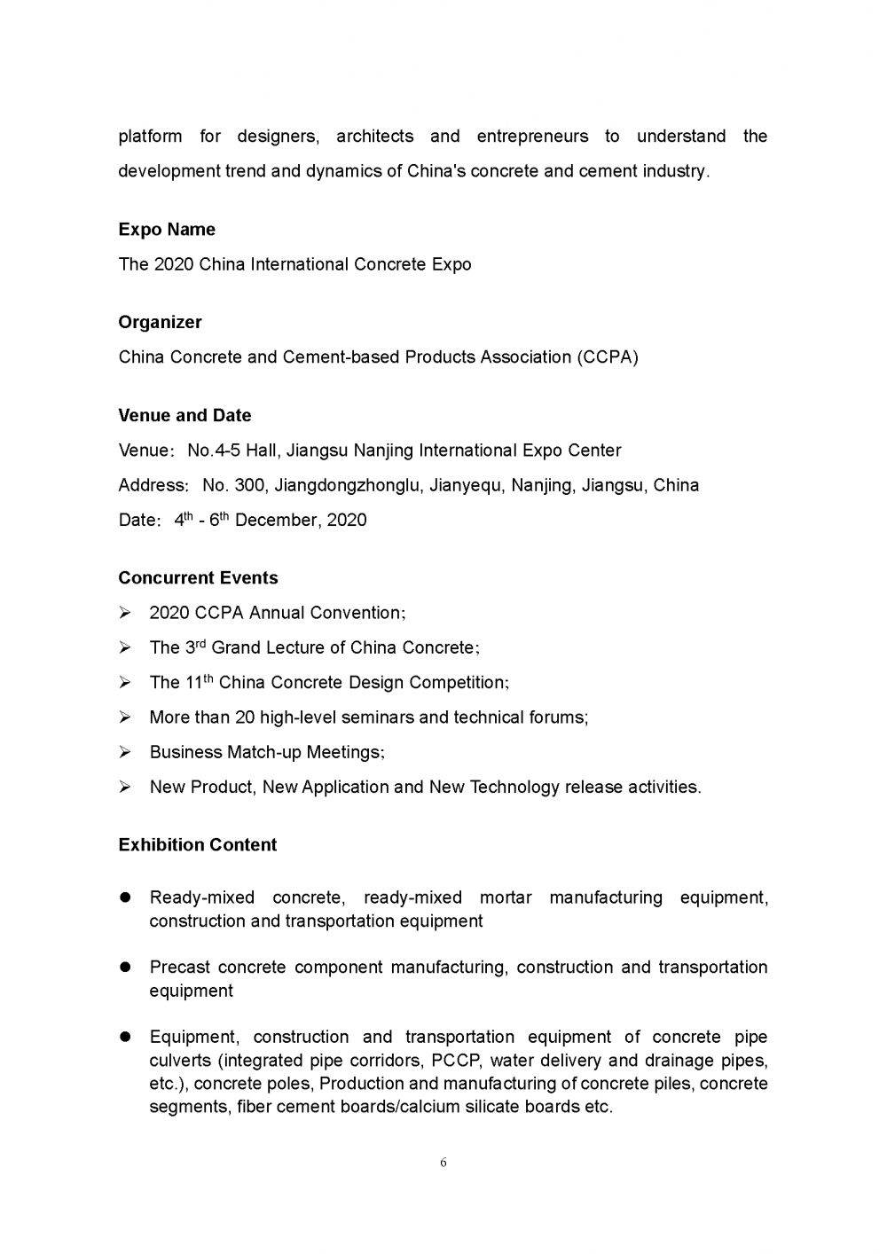 China International Concrete Expo is the only international professional exhibition sponsored by China Concrete and Cement-Based Products Association (CCPA), which focuses on the new technology, technique, equipment,products that related industries upstream and downstream of concrete and cement-based products. “Based on China, focusing on the world”, the exhibition will not only fully demonstrate the progress and development of China's concrete and its whole industrial chain, but also be the vane of the development of concrete and cement-based products in the world, there are huge market prospects and business opportunities.